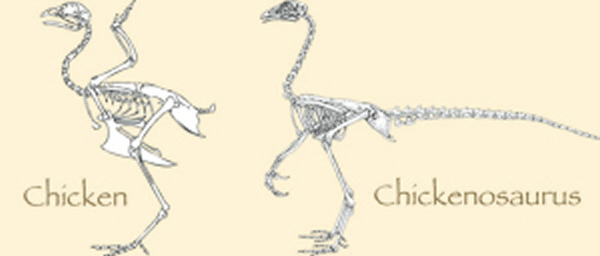 杰克·霍纳博士带着记者进入了他那位于落基山博物馆地下室的办公室里。在一堆显示器、奖牌、家人照片和一个三角龙头骨之间,他找出了一只完整的家鸡骨架。“家鸡和恐龙的骨架非常相似,”他很认真地说,“我们打算把研究重点放在几个比较明显的区别上。”其中最明显的一项就是两足恐龙大多具有一条挺直而略微上翘的尾巴,以平衡身体,所以让家鸡长出长长的尾巴将是第一步。