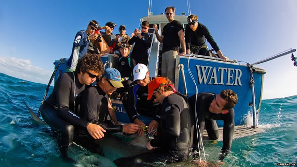 佛罗里达州迈阿密大学的研究人员们已经完成了第一批卫星标签研究工作来查明生态旅游如何对虎鲨造成影响。在保存生态群落上的辩论非常激烈,是否潜水公司提供与鲨鱼潜水能够伤害这些群体。