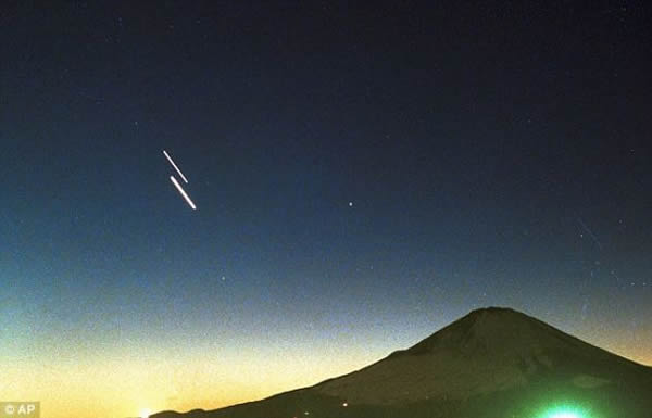 这是在1999年在日本富士山上拍摄的金星合木星天象。这是一幅延时摄影作品,展示了两颗行星在夜空中运动的轨迹