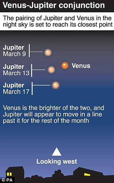 英国皇家天文学会发言人罗伯特·梅塞(Robert Massey)说:“尽管‘合’这种天象并不罕见,但是这一次合的特殊之处在于它的壮观程度。”他说:“这两颗行星都是夜空中非常明亮的。如果你知道它们的位置,你甚至可以在白天看到天空中的金星。这样两颗行星靠在一起将非常美丽。它们看起来就像是夜空中的两盏明灯。而对于观测它们的爱好者们而言这同样非常有趣,因为这是每个人都能去观察的天象。在今晚我们居住在北半球的居民可以向西南方天空观察。在接下来的几天里,这两颗行星将逐渐向西偏离。尽管这两颗行星在接下来数天里就将开始逐渐彼此远离,但是木星在接下来的至少数周内仍旧可以看到。”