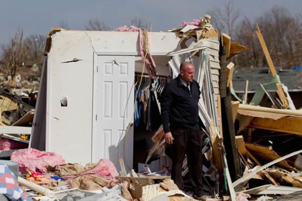 一名男子正在美国伊利诺斯州哈里斯堡查看已故岳母的住宅废墟。这座被毁的住宅遭受了龙卷风袭击,这是上周从美国中西部和南部地区经过的几十场龙卷风中的一场。这场龙卷风导致5个州至少39人丧生。速度高达每小时180英里(290公里)的这场龙卷风直径大约275码(250米),在哈德斯堡着陆时强度是4级,藤田级数的强度一共5级。总部设在俄克拉荷马州纽曼美国国家海洋和大气管理局暴风雨预测中心的名誉退休主管约瑟夫-谢尔费博士称,它包含的能量相当于16万千瓦时。这是美国5000户普通家庭一天消耗的电量。