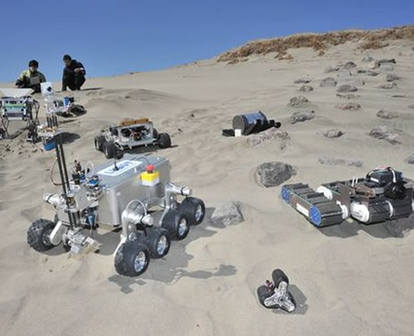 3月13日,科学家们在静冈县滨松市(Hamamatsu)沙丘地区对8个机器人进行了测试,这里的地形条件与月球上相似。这些机器人由日本宇宙航空研究开发机构(The Japan Aerospace Exploration Agency)、数所大学及其它一些研究机构联合制造,用于执行2025年左右进行的登月任务。