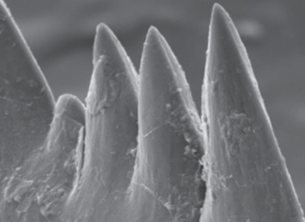 在扫描电子显微镜下,牙形虫化石的牙齿比迄今已知的任何牙齿都要尖利,其宽度仅为2微米。图片利用:D. Jones