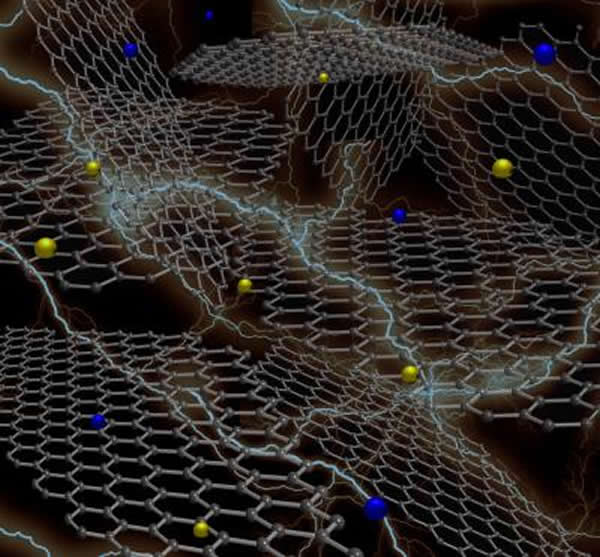 图形演示石墨单原子层的独特能力:一单层的石墨能透过与离子在电化学电容器里的相互作用来存储电。