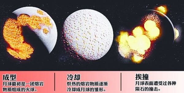 科学家们认为,月球是在45亿年前,由一枚火星大小的陨石撞击地球产生的大块碎片形成的。在巨大的撞击下,大量的炽热物质被抛到太空中,成了月球形成的“原料”。NASA的视频就是从这些“原料”进入太空后开始的。起初出现的是一团燃烧着的橘红色熔岩物质,这团火球逐渐冷却,形成青灰色的星球表面。