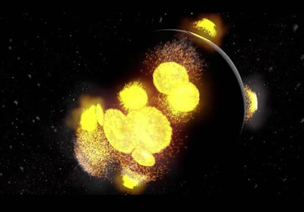美国宇航局的这段3分钟视频以人们可以理解的程度显示小行星飞向月球,之后时间加速显示数以千计的小行星碰撞月球表面。