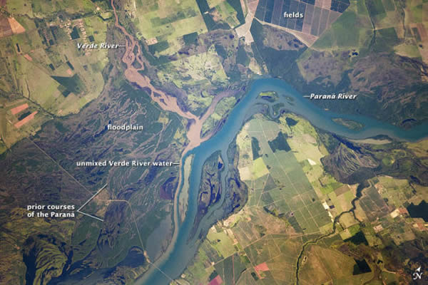 巴拉那河位于巴西的马托格罗索州(Mato Grosso)和圣保罗州(Saõ Paulo)边界附近,看起来像是一条宽阔、蓝色的带子。另一条泥泞的棕色河流——弗德河(Verde River)从西北(左上)流入巴拉那河。在这张照片的左边,一片宽广的泛滥平原(深绿色)占据了大部分面积。这个泛滥平原大约宽11公里,中间有一条公路穿过。