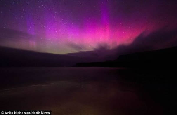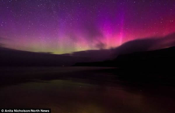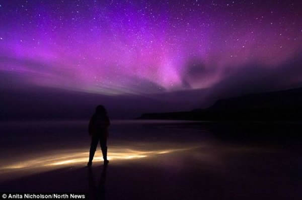 尼科尔森家住诺森伯兰郡的锡顿德勒沃尔,她说:“我专门来到埃格岛庆祝自己的生日。听到出现北极光消息后,我立即带着相机跑到海滩,花了几个小时捕捉下绚丽的景象。我的好友麦克-莱德利是一位摄影师,他对我说‘眼睛要一直盯着天空’,我照办了。我能够清楚地看到北极光,但却看不到它们的颜色。直到看照片时,我才发现它们绚烂的色彩。英国很少出现北极光,这是我重新工作前的最后一次旅行,能够拍到北极光实在非常幸运。”