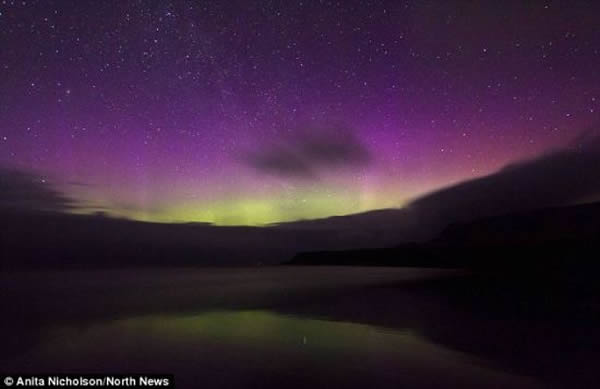 上周,摄影爱好者安妮塔-尼科尔森在苏格兰西岸10英里(约合16公里)的埃格岛拍下了这幅照片,展示了引人注目的北极光景象