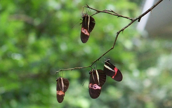 每当夜晚睡觉的时候来临,红色邮差蝶(Heliconius erato)总是会四五成群地栖息在一起。为了搞清其中的奥秘,研究人员在巴拿马和哥斯达黎加的森林中悬挂了数以千计的假红色邮差蝶。