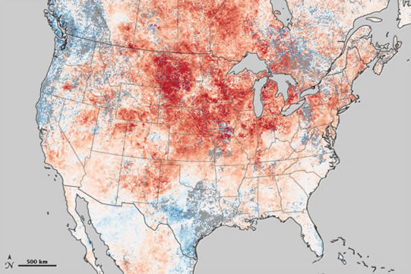 高温造成的热浪强度和范围在这幅地图中清晰可见。这幅地图是根据美国宇航局泰若卫星(Terra)获取的数据绘制的,显示了北美地区2012年3月8-15日期间的温度与2000-2011年同期平均温度的对比。温度高于平均气温的地区以红色显示,温度接近平均温度的地区显示为白色,温度低于平均气温的地区显示为蓝色。
