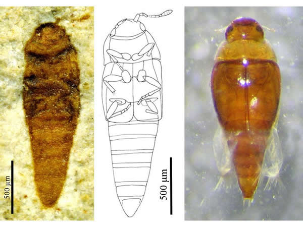 近日,中国科学院南京地质古生物研究所硕士研究生蔡晨阳、黄迪颖研究员和美国堪萨斯大学A. Short博士等在早白垩世热河生物群(距今约1.25亿年)发现了世界上第一块藻食亚目昆虫化石,并归入现生属Hydroscapha,命名为Hydroscapha. jeholensis(热河水缨甲)。该新种体型十分接近某些现生代表,但其触角末端一节保留有3条明显的融合线易与现生种区分。热河水缨甲是目前最早的水缨甲科代表,同时也是最早的藻食亚目甲虫代表。该标本十分微小,长仅1.75毫米,是目前已知最小的甲虫化石之一。