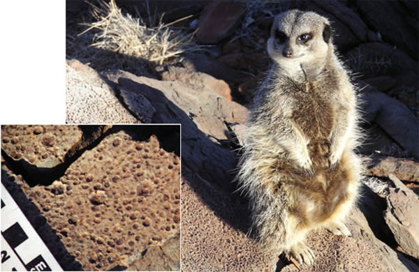 研究人员表示,虽然大气密度不影响雨滴的最大尺寸(约6.8毫米),但它的确会影响一滴水的终端速度,并进而强烈地影响着雨滴的最大动量和它落地时所留痕迹的大小。通过对27亿年前的一场火山爆发后(见主图中痘痕状的平面)不久凝固的火山灰中最大雨滴痕迹(插图)的尺寸进行测量,并将其与实验室测试中拥有不同大小和动量的水滴所留下的痕迹作比较,该研究团队推测,27亿年前地球无氧大气的密度很可能是如今空气的50%~108%,很明显要比其现在的密度小两倍,而这种厚度根本不足以抵消当时太阳昏暗的照射。在当时的大气密度范围内,即使是更高度的二氧化碳聚集也不够来对抗虚弱的“年轻”太阳。这表明,当时是甲烷、乙烷或者其他强烈的温室气体使地球免遭冻结。