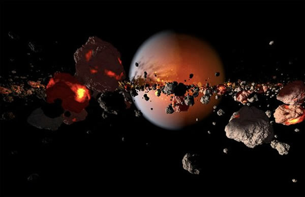 大多数科学家认为,地球与一个被称为忒伊亚(Theia)的火星大小的行星相撞,形成岩浆圆盘围绕我们的地球运行,后来岩浆合并形成月球。这就是所谓的大碰撞假说。电脑模型表明,碰撞说符合物理定律,月球至少有40%的岩浆来自忒伊亚。