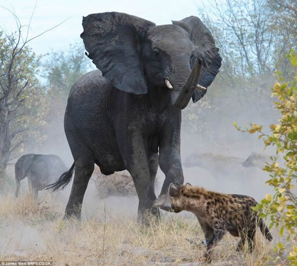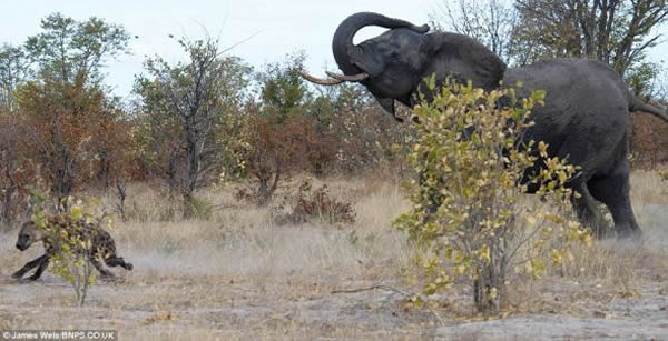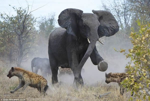不平等的战斗:这些土狼根本没有机会抵抗愤怒的母象,它在最愤怒的时候连根拔起几棵大树。