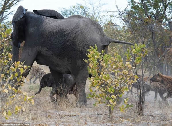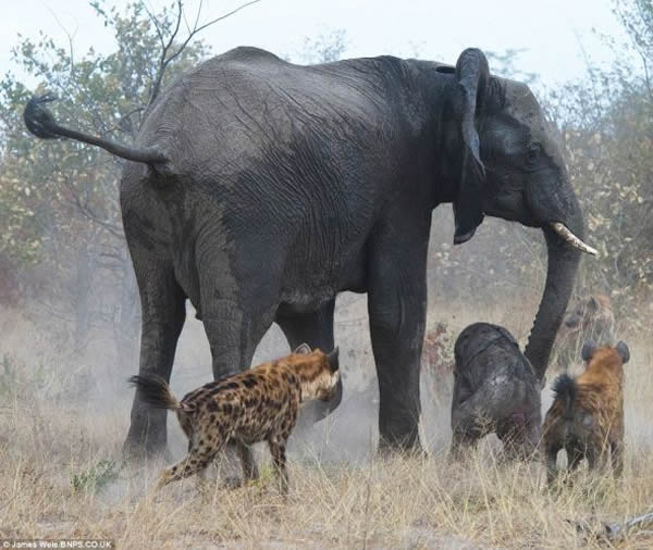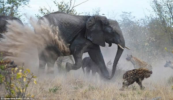 维尔斯说:“母象不顾一切地反击土狼,几棵树都被它撞倒。土狼攻击计划失败,消失在母象扬起的尘土中。幼象的尾巴被土狼咬掉,但并无大碍。在非洲,你会经常看到大象没有尾巴。我们看到的这一切真是太扣人心弦了!”