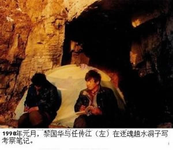 1990年元月,黎国华(右)与同伴在迷魂趟水洞子写考察笔记。