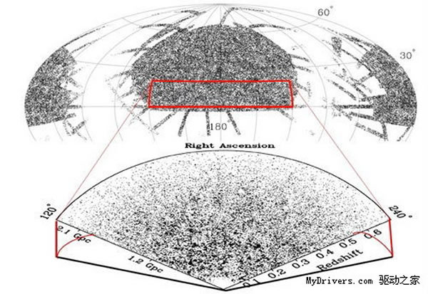 国家天文台发布的13万多个星系团在宇宙空间中的分布(1Gpc约等于32.62亿光年)