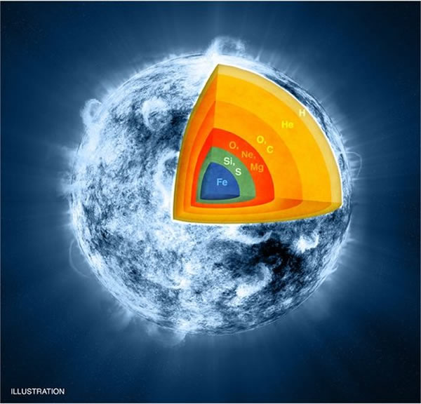 超新星爆炸前内部元素的分布模式(不同的元素分别用不同的颜色区分)