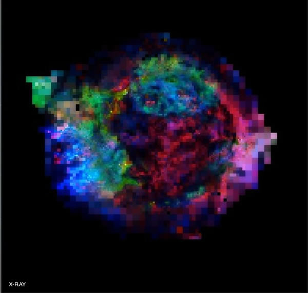 一组科学家通过使用钱德拉X射线天文望远镜对仙后座A(Cassiopeia A)进行了长期的观测后,绘制出超新星爆发遗迹中存留的元素分布图,以前所未有的详细程度揭示了大质量恒星在死亡之后内部物质随着殉爆而飘散于宇宙空间中的情景,显示了在原超新星爆发三百年后的残骸扩散层分布,揭示神秘力量推动内侧元素以更快的速度向外扩散。