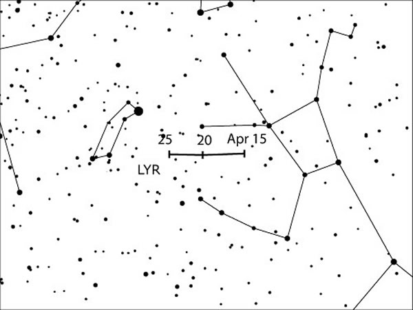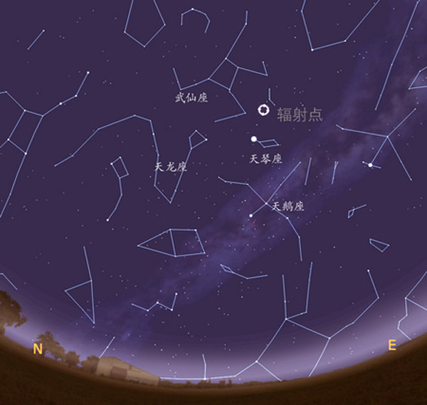 在上半年,流量较大的流星雨并不多见,其中天琴座流星雨曾在1982年出现了极大ZHR(辐射点位于天顶的每小时流星数)90左右的爆发。该流星雨的辐射点位于天琴座与武仙座之间,活跃期从每年的4月16日至25日。该流星雨的极大持续时间并不长,只有短短几个小时。在它的活跃期,辐射点升起到合适的地平高度以上,在北半球需要等到地方时22时以后。2012年天琴座流星雨的极大将出现在北京时间4月22日5时30分至16时30分。在这个时间段,我国大部分地区都是白天,无法进行观测。今年的极大时间更适合北美洲的观测,而我国的最佳观测时间是在22日凌晨至天亮之前。天琴座流星雨的流量虽然不大,但今年的观测仍有一大利好,就是极大正值无月夜,我们可以在没有月光干扰的纯净夜空里欣赏一次流星雨。