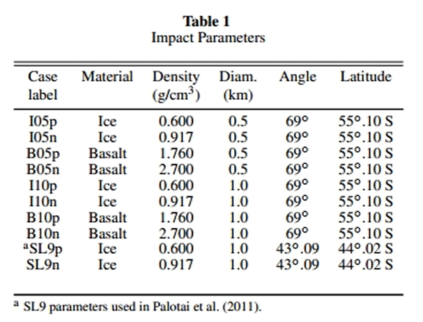 使用三维流体力学代码,研究小组模拟了8次天体碰撞,他们选用的天体直径分别为0.5千米和1千米,不同的密度和成分(玄武岩或者冰)。通过使用相同的碰撞角度(69度)和碰撞速度(61.4千米/秒),研究小组能够将2009年7月碰撞木星的天体可能的体积和构成成份缩小在较小范围内。