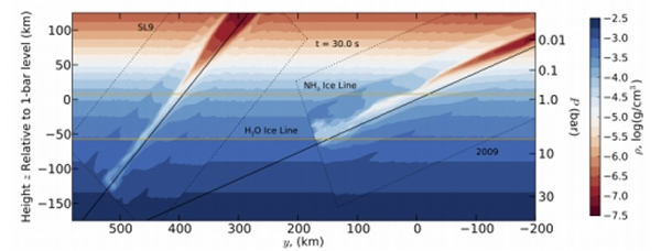 通过将苏梅克/列维9号彗星作为2009年碰撞事件的模拟对比,显示出碰撞形成羽状烟柱的差异性。2009年天体碰撞木星的角度将形成较浅的碰撞深度,以及较小、较平缓的烟柱。研究小组的模拟结果显示0.5千米直径天体碰撞可产生较小、平缓的烟柱,而1千米直径天体则可以产生较大、较快的烟柱。