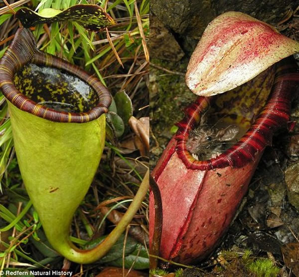 图2中左边显示的是新发现的猪笼草品种,由英国著名的自然学家大卫·艾登堡禄(David Attenborugh)命名。右边的图中则为一只小老鼠被吞噬的情景。通常情况下,食肉植物的分泌的酸性液体将猎物的软组织等部位溶化分解,最后将猎物的尸骨剩下。图尔特·麦克弗森先生表示这种植物通常色彩缤纷、颜色艳丽,这样可以吸引猎物,尤其是昆虫。可以认为所有带有瓶状叶型囊包的植物都是肉食性的植物,因为这种器官进化出来便是为了吞噬和消化昆虫等动物。食肉植物需要昆虫等动物的营养物质,而土壤中缺乏它们所需的养分。