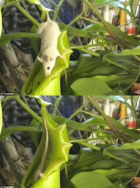 对于该恐怖巨型食肉植物而言,不论是小老鼠还是体型较大的动物,都可以将其吞噬,甚至可以将被吞噬动物的牙齿和骨骼消化干净。图1上中显示的便是一个倒霉的小老鼠,它并没有意识到自己已经站在一种恐怖的食肉植物上,第1下的图中小老鼠已经落入食肉植物的吞噬袋中,成为植物的免费午餐。匙叶猪笼草属于猪笼草科植物,生长于苏门答腊岛和爪哇岛,是一种热带食肉植物,但是这种植物并没有传说中食人植物那般危险。
