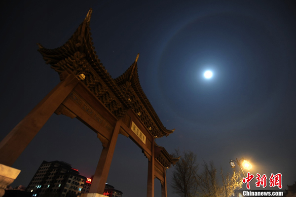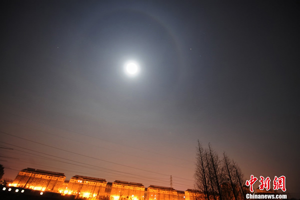 江苏扬州市区上空出现罕见的“月晕”现象 来源: 蜘蛛网 时间:2012年4月06日 12:44 江苏扬州市区上空出现罕见的“月晕”现象 江苏扬州市区上空出现罕见的“月晕”现象 江苏扬州市区上空出现罕见的“月晕”现象 4月5日晚23时许,江苏扬州市区上空出现罕见的“月晕”现象,一个若隐若现的、大大的圆环罩在月亮周围,甚为壮观,整个过程持续1个多小时左右,据悉,月晕是月光经高空中的冰晶折射而形成的晕。 中新社发 孟德龙 摄 图片来源:CNSPHOTO 上一篇 下一篇 TAG: 月晕