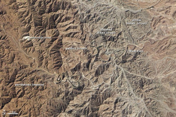 美国宇航局的地球观测卫星(EO-1)的先进陆地成像仪(ALI)在2012年3月6日拍下这幅蛇绿岩地貌的自然色照片。照片的中心是菲兹干谷( Wadi Fizz),除了蛇绿岩外,那里有一些铬铁矿矿床。