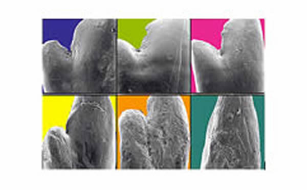 慈鲷牙齿微观结构。上面一行牙齿主要咀嚼藻类,下面一行在粗糙岩石表面刮取营养物质
