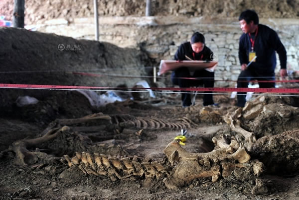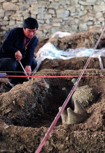 这座墓建造在距离沂水县城东南40公里的“纪王崮”顶。经过近两个多月的清理发掘,考古人员已基本弄清墓葬形制和埋藏情况。根据墓葬残存部分判断,墓室总体平面呈南北向的长方形,南部为椁室,北部为车马坑。墓室残长约28米,宽13.6米。车马坑只残存中部一段,东西宽4米,南北残长7.5米,残存马车为4辆,其中一辆车内出土有鼎、鬲、敦三件车载青铜器,这一现象为山东地区首次发现。