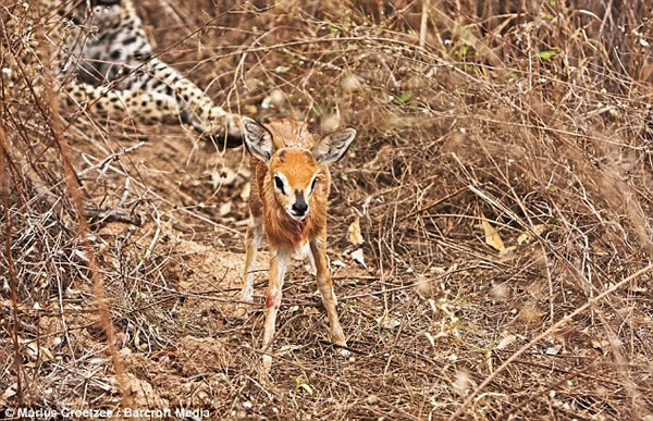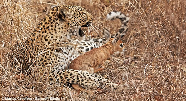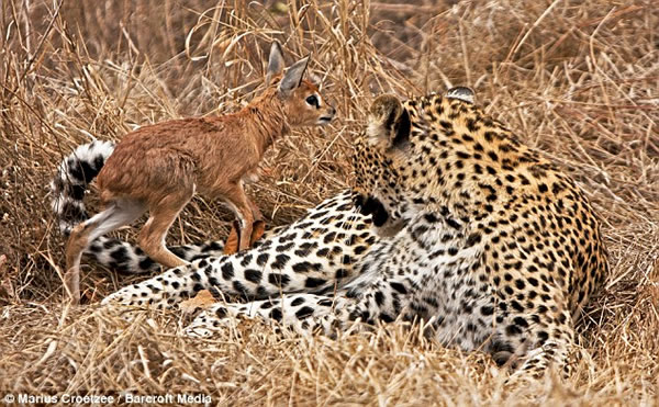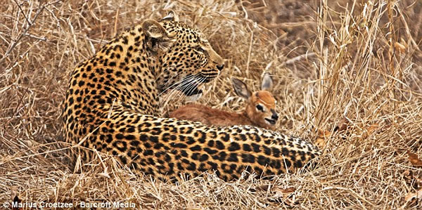 一名叫做马里斯的南非导游拍下这个过程。他最先拍下这两只动物趴在一起的照片,还以为在那一瞬间,自然界残酷的弱肉强食法则不存在了。可没过多久,豹子的本性便散发出来,突然将爪子伸向羚羊使其逃脱不了,并张开满是锋利牙齿的嘴巴向其咬去。只是小羚羊刚出生不久,一点都未察觉。