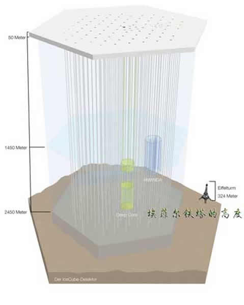 巨大的南极“冰立方”中微子探测器与埃菲尔铁塔大小对比图