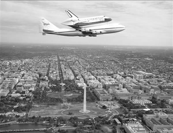 4月17日,“发现”号航天飞机搭乘一架波音747飞机从美国首都华盛顿上空飞过。