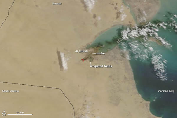 美国宇航局地球观测站今日公布了一张卫星照片,展示了发生在科威特中部城市杰赫拉(Al Jahrah)的火灾景象。