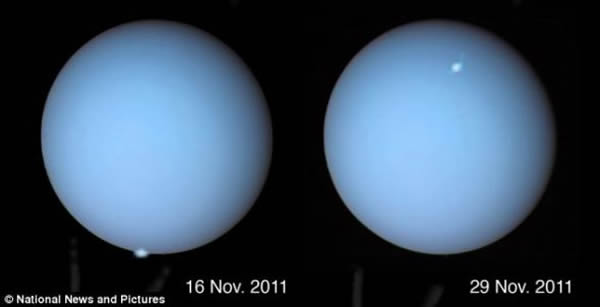 研究人员通过新观测资料,在天王星的光面(从哈勃太空望远镜方向看到的天王星的一面)两次发现光斑。以前只能利用从附近飞过的飞船上的仪器,才能观测到这种遥远的极光。地球上的极光会在长达数小时内把天空渲染成绿色和紫色,但是新发现的天王星极光与之不同,它显然只能持续几分钟。通常极光是磁气圈的一大特征。磁气圈是一颗行星的周围区域,它受磁场控制,通过太阳发出的稳定带电粒子流——太阳风形成。