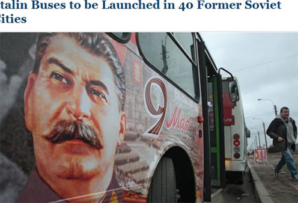 为了庆祝5月9日卫国战争胜利日,印有前苏联领导人斯大林头像的公交车将出现在40个前苏联城市的街道上,这些城市分别属于5个国家。