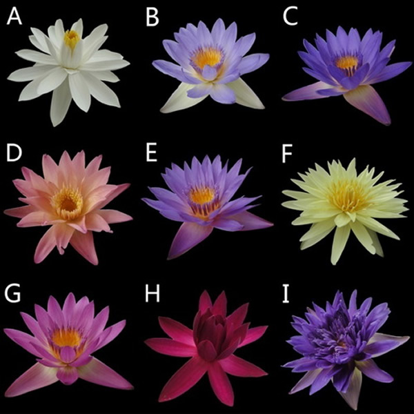 热带睡莲9种代表性的花色:‘埃及白’(A)、18(B)、27(C)、‘艾伯特’(D)、34(E)、‘黄金国’(F)、37(G)、‘印度红睡莲’(H)和‘泰国王’(I)