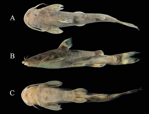斜斑纹胸鮡模式标本图 A背面,B 侧面,C 腹面