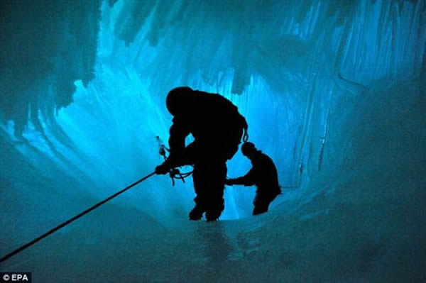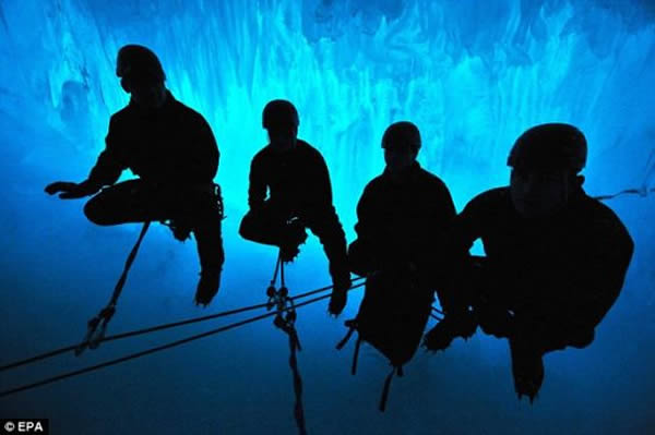 藏于地下的奇观:英国皇家海军陆战队士兵进入南极洲偏远岛屿罗瑟拉岛的一个冰洞。