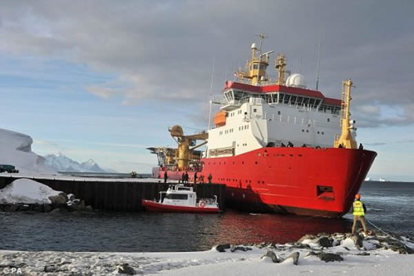 英国皇家海军舰艇保护者号破冰船:这艘英国海军船停靠在南极洲罗瑟拉冰上科学站。这是这艘破冰船有史以来到过的最南端。