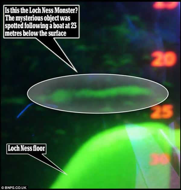 这幅声纳生成的图片是由尼斯湖上一游船的船长马卡斯•阿特金森(Marcus Atkinson)获得的,图片中显示了在深水中有一个巨大的不明生物体。这个神秘的生物在水下大约23米深的地方,大约有1.5米宽。