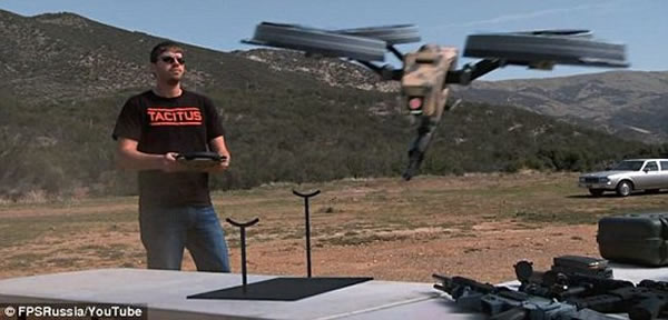 “FPS俄罗斯”演示了一架四翼无人直升机装配机关枪,可实现强制性火力攻击