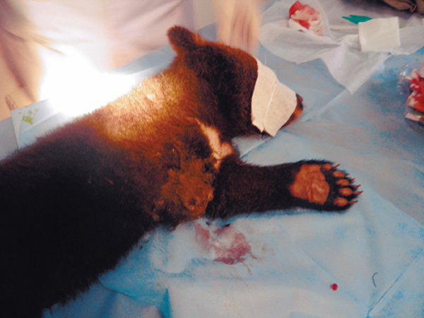 赶到医院后,小熊引起不少看病市民围观,小熊在笼子里可怜巴巴地低着头,医护人员为小熊紧急开通绿色通道。由麻醉师为小熊麻醉后,医生将其多余部分组织截掉,将筋肉分两侧缝合,一共缝了20多针。经过半个多小时的手术后,小熊脱离生命危险,并苏醒过来。不过由于被咬掉的爪子已经粉碎无法接上,这只可怜的小熊以后只能三条腿走路了。