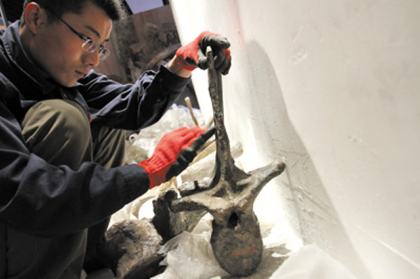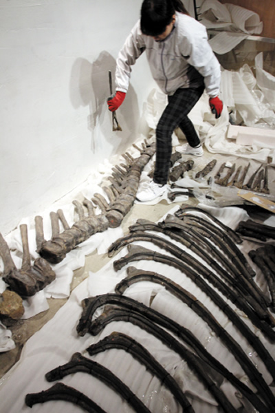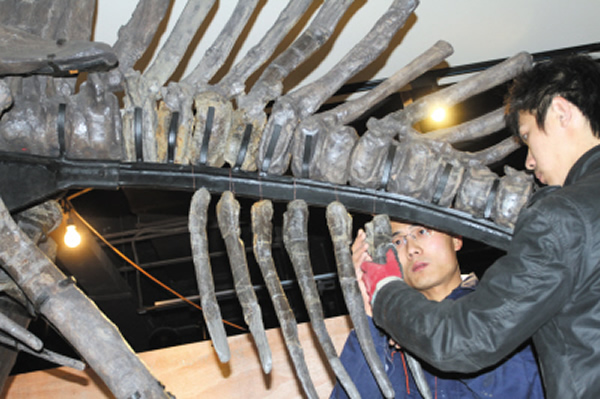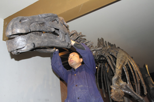凿子、刷子、螺丝刀……一排排工具整齐的摆放在狭长的木质操作台上;一张张打开的包装纸上铺着各式各样的骨骼。技术安装人员小心翼翼地从地上捡起其中的几段骨骼,用刷子将骨骼上的浮土扫净,再用工具将骨骼一段一段地对接,拧上螺丝加固,恐龙的一个分段身体就组装好了。这些分段安装在一起,一只活灵活现的恐龙就站在面前。据工作人员介绍,一具恐龙模型如果有25%的骨骼为化石,就能称其为真品,而这具模型的骨骼化石高达80%,实属珍品。