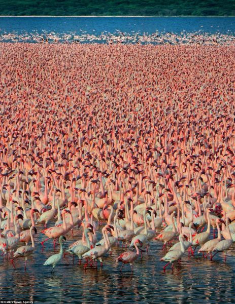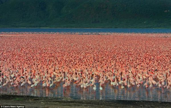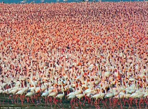 几百万火烈鸟前往这里繁殖,将博格里亚湖变成一片粉红色的海洋