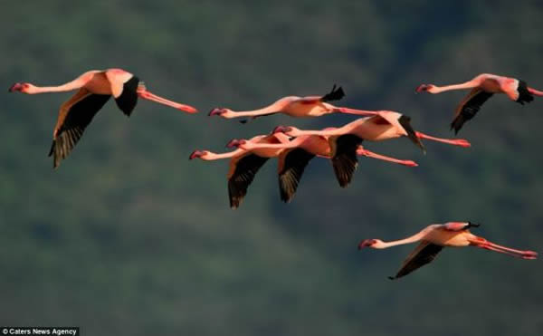 几只火烈鸟正在飞往有着“火烈鸟城”的博格里亚湖保护区
