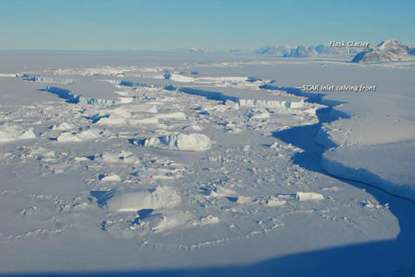 对冰川学家来说,观测南极半岛气温变化很有意义。2002年,庞大的拉森B冰架在几周内解体。SCAR湾(SCAR Inlet,SCAR是“南极研究科学委员会”的缩写)冰裂面就是拉森B冰架的残留物。